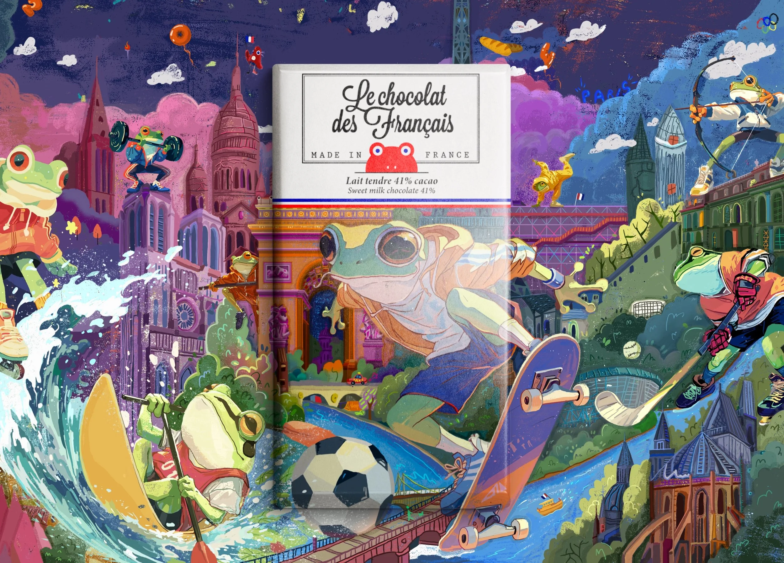 Le Chocolat des Francais is combined with the Paris 2024 Olympic Games, plus iconic landmarks such as the Eiffel Tower, the Seine and the gardens of Versailles. Special Olympic elements such as the torch relay, sporting events, opening ceremony and mascots will also be incorporated. In addition, the red frog, the distinctive emblem of this chocolate, will be the protagonist, replacing the characters in the image.